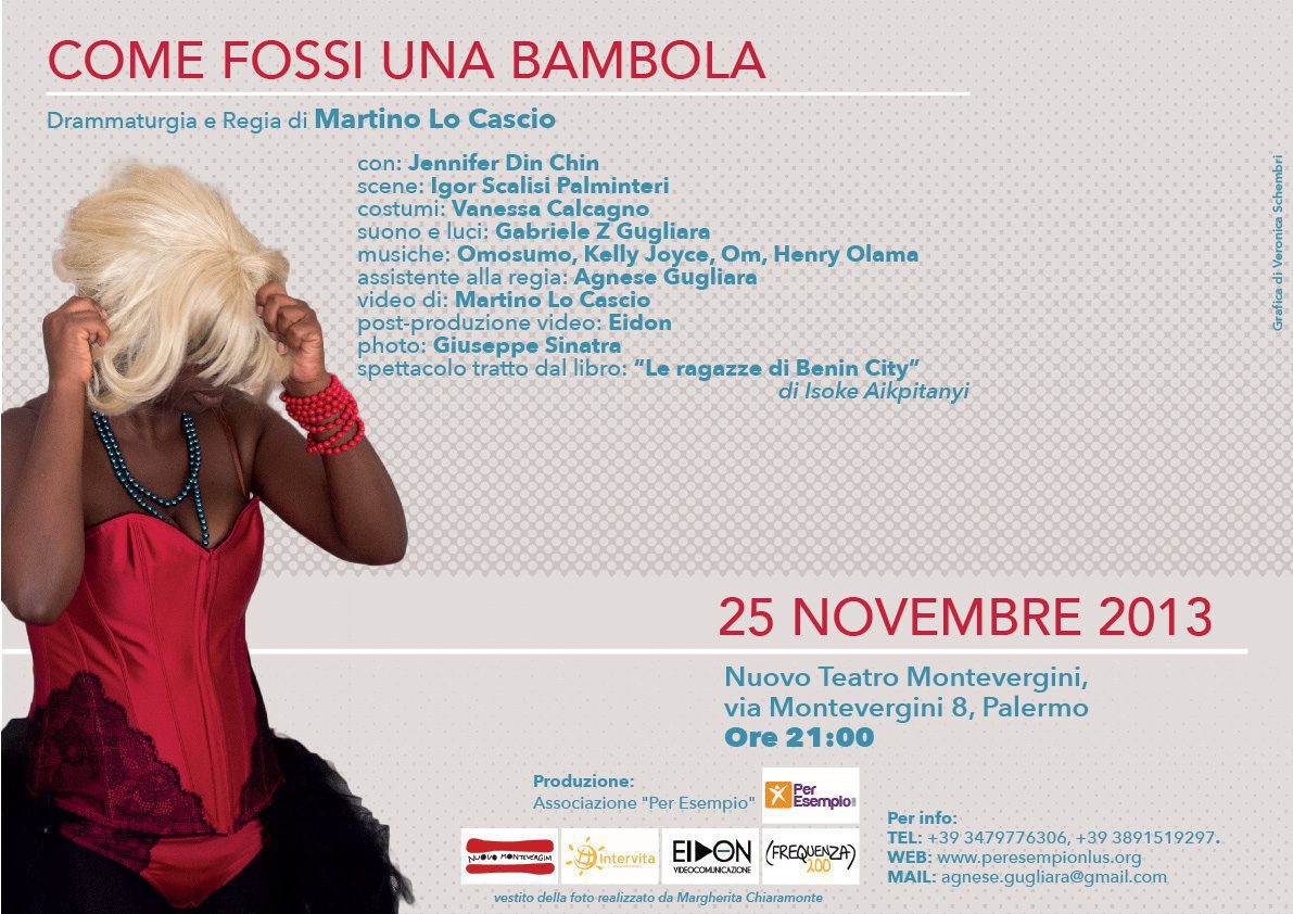 “Come fossi una bambola”, scritto e diretto da Martino Lo Cascio, interpretato da Jennifer Din Chin, è un monologo che prende spunto da “Le ragazze di Benin city”, autobiografia audace e lucida di Isoke Aikpitanyi, nigeriana vittima della Tratta e riuscita coraggiosamente a riscattare la propria condizione di sudditanza. Oggi, inoltre, Isoke ha creato un centro per aiutare fattivamente altre “schiave” tuttora costrette alla lercia vita in strada.
