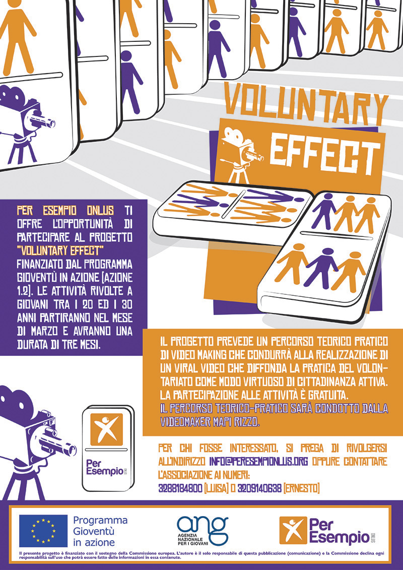 Per Esempio Onlus con il supporto del programma Gioventu in Azione organizza insieme ad un gruppo di giovani palermitani, appassionati di fotografia e videomaking un percorso laboratoriale, durante il quale è possibile approfondire le competenze in materia (utilizzo videocamera/fotocamera, strumenti audio, riprese, montaggio ecc.) per arrivare alla realizzazione di un prodotto video che a fine percorso verrà lanciato nel web.
