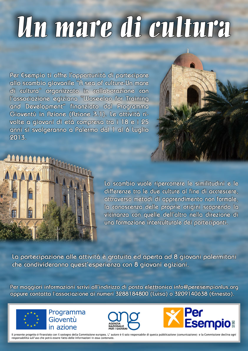 Per Esempio ti offre l’opportunità di partecipare allo scambio giovanile “ A sea of culture- Un mare di cultura” organizzato in collaborazione con l’associazione egiziana “Waseela for Training and Development” finanziato dal Programma Gioventù in Azione (Azione 3.1). Le attività rivolte a giovani di età compresa tra i 18 e i 25 anni si svolgeranno a Palermo dal 01 al 06 Luglio 2013.