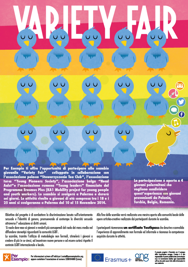 Per Esempio ti offre l’opportunità di partecipare allo scambio giovanile “Variety Fair” sviluppato in collaborazione con l’associazione polacca “Stowarzyszenie Tea Club”, l’associazione turca “Young Pioneers Society”, l’associazione belga “Head Aalst”e l’associazione rumena “Young leaders” finanziato dal Programma Erasmus Plus (KA1 Mobility project for young people and youth workers). Lo scambio si svolgerà a Palermo e durerà sei giorni. Le attività rivolte a giovani di età compresa tra i 18 e i 25 anni si svolgeranno a Palermo dal 10 al 15 Novembre 2014.