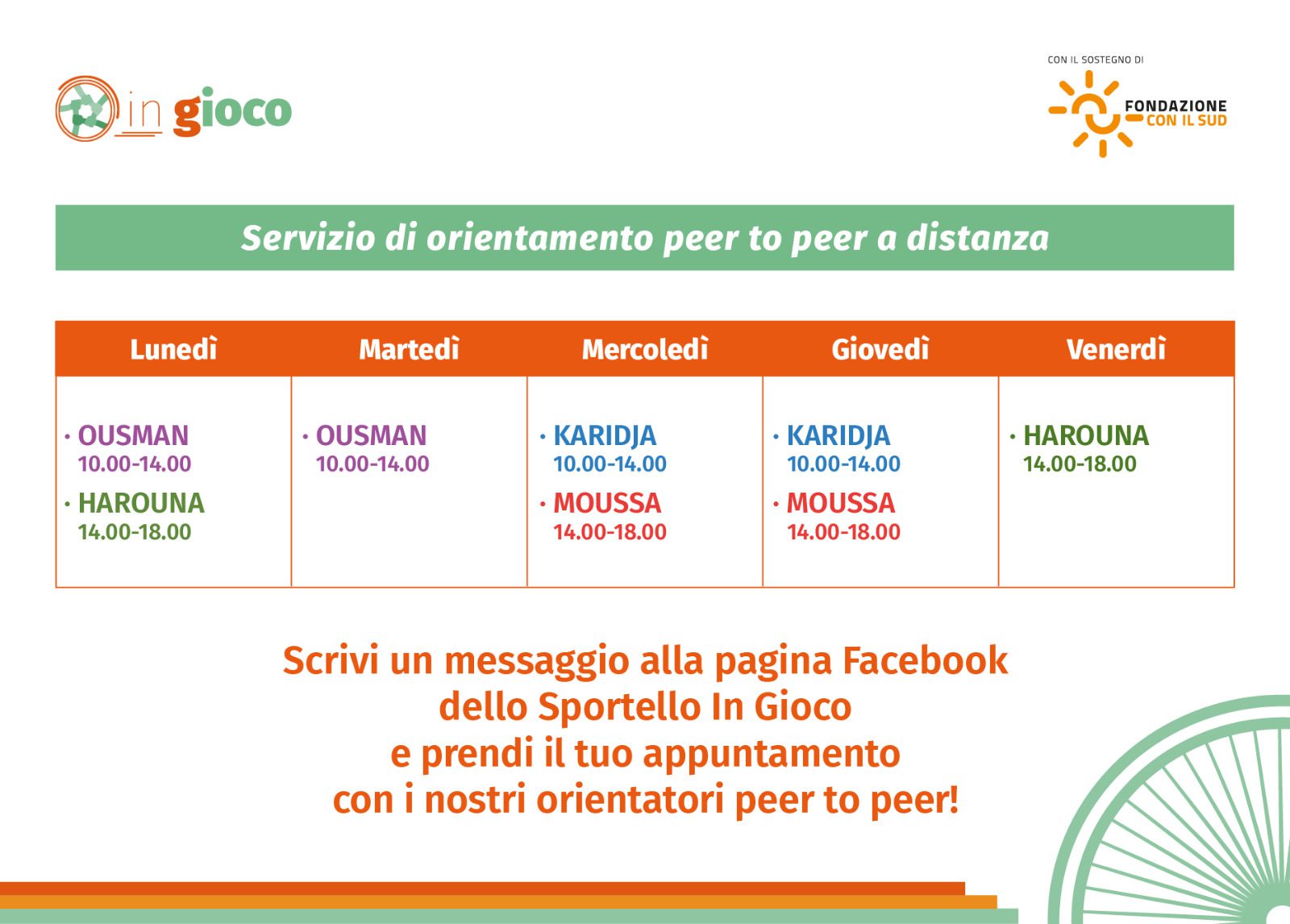 Gli orientatori peer to peer del progetto In Gioco restano a disposizione degli utenti anche a distanza. Karidja, Harouna, Moussa e Ousman continueranno ad offrire a chiunque lo desideri l’opportunità di informarsi, aggiornarsi e ottenere il supporto giusto per pianificare il proprio futuro lavorativo. Dalla scorsa settimana è infatti attivo il servizio di sportello a distanza, garantito tutti i giorni dal lunedì al venerdì negli orari seguenti: