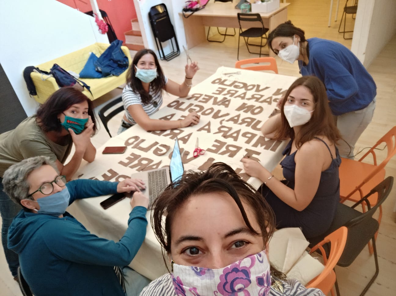 Anche il corso di sartoria è proseguito: le donne hanno ritagliato, nelle loro case prima e tutte insieme allo Spazio Donna ZEN appena terminato il lockdown, lettere di stoffa per comporre una poesia di Chandra Livia Candiani. La poesia è stata cucita su 5 stendardi della dimensione di 1,20 per 3 metri: il nostro Wall of Dolls.